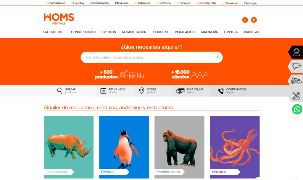 Homs Rentals opera 14 delegaciones y supera los 5.000 activos, centrados en construcción, rehabilitación y eventos. La tienda online permite contratar maquinaria, módulos y estructuras con pocos clics y carrito unificado de pago seguro instantáneo.