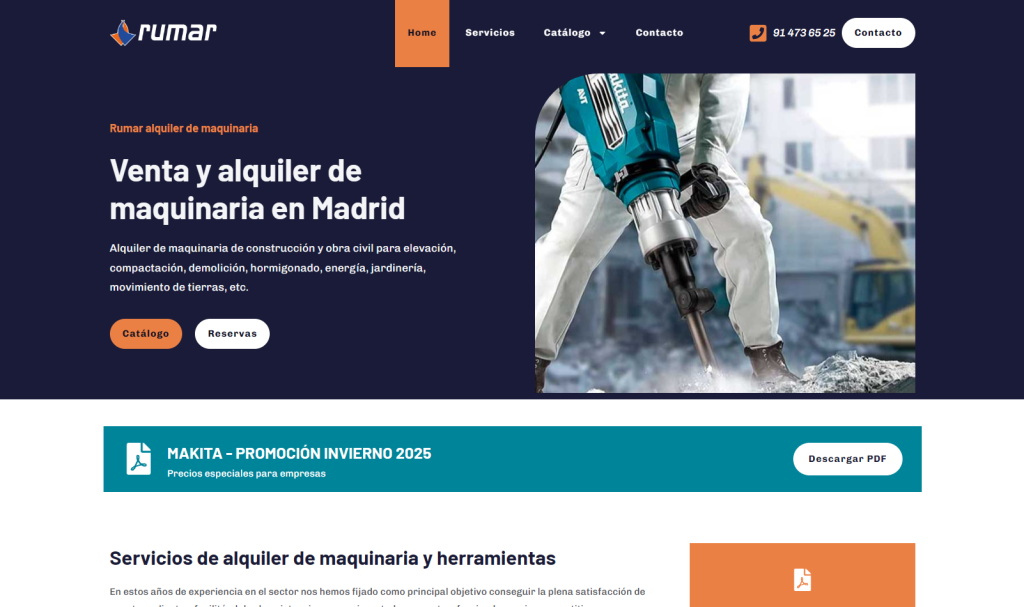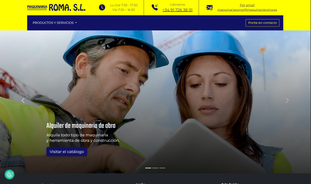 Maquinaria Roma, con base en Madrid, ofrece uno de los catálogos más extensos, más de cincuenta categorías como compactación, corte diamantado y elevación. Su web permite filtrar por tarea y potencia, agilizando la elección rápida.